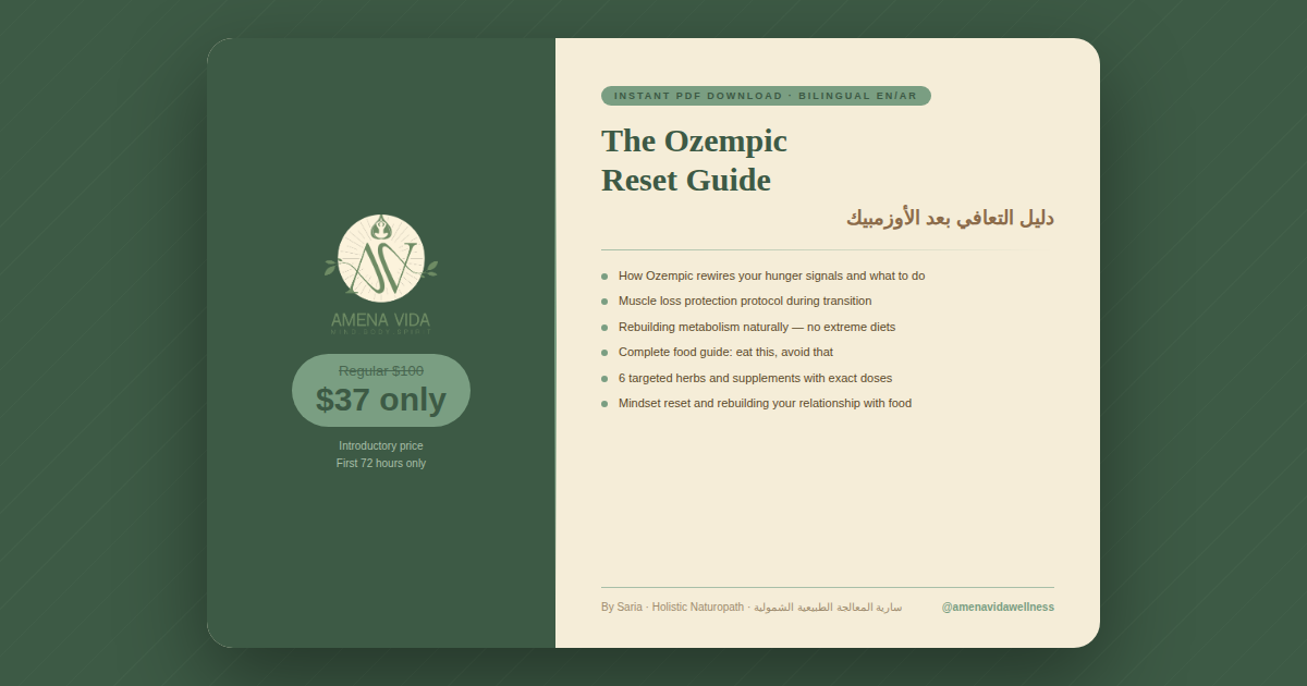 A root-cause naturopathic recovery protocol for anyone who has stopped Ozempic and wants to rebalance their body naturally. Covers hunger signals, muscle protection, metabolism rebuild, food guide, herbs & supplements, and mindset reset. Bilingual English & Arabic. Instant PDF download.